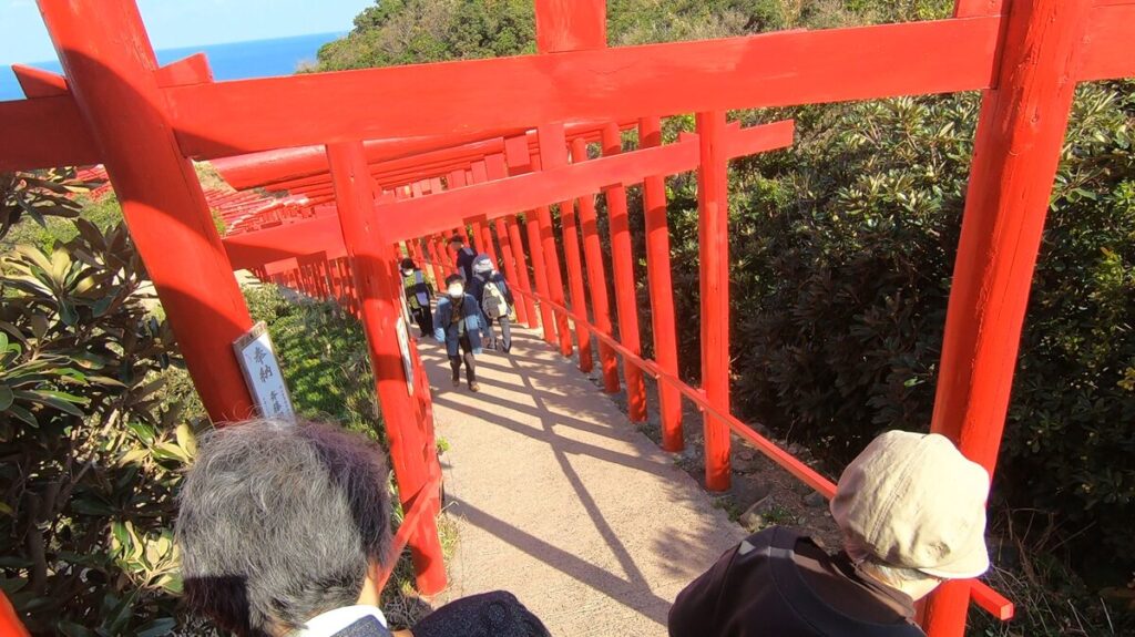 昭和62年から10年かけて奉納された123基の鳥居が、海へと続くように100m以上にわたって並ぶ光景はまさに圧巻。