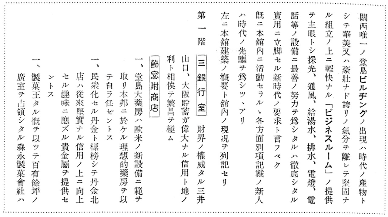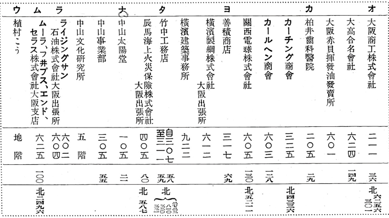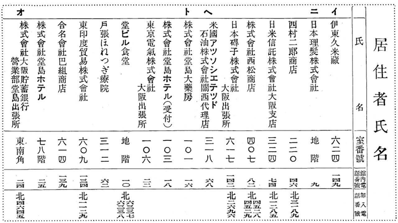 しかし、当時の大阪の商店の基本は、自前の店舗を構えることであり、ビルに入居する習慣はなかった。テナントを埋めるにはかなり苦労したようだ。そのため初期からのテナントには、橋本喜造の国際的なネットワークもあってか、米国アツソシエテツド石油株式会社関西代理店、カーチング商会、カールヘン商会、紐育ドツチ・エンド・セーモア商会など、外国の商社の日本事務所が目につく。