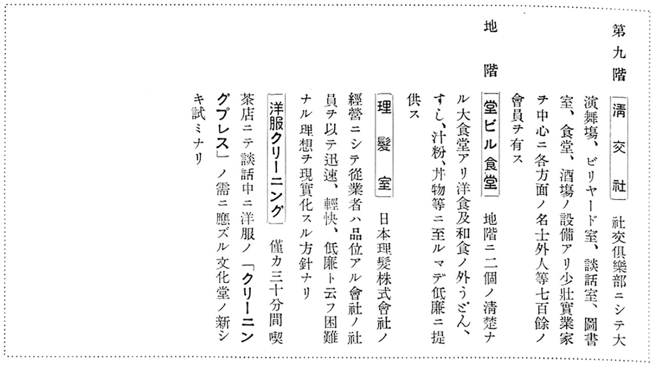 開館当初から1階に銀行や郵便局、地階には食堂や理髪店、クリーニング店、2階には百貨店などが入居し、館内でたいていのものが揃った。3階から6階までは貸事務所で、7階、8階、屋上庭園は堂島ホテル解散後に直営となる堂ビルホテルが運営した。