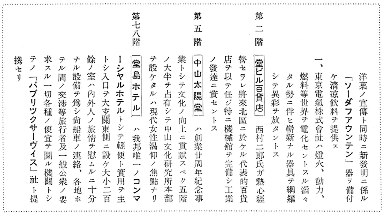 1919(大正8)年に設立された大阪変圧器株式会社(現・ダイヘン)も、竹中工務店の本社移転後に、堂島ビルヂングに営業所を構えていた。ダイヘンの社史には、堂ビル女学院の女学生とエレベーターや廊下ですれ違う社員のエピソードが記載されている(『大阪変圧器五十年史』大阪変圧器、1972年)。堂島ビルヂングは文化センターであるとともに、多くの学生や企業家の保育器となり、巣立っていく様子を見つめていくことになる。