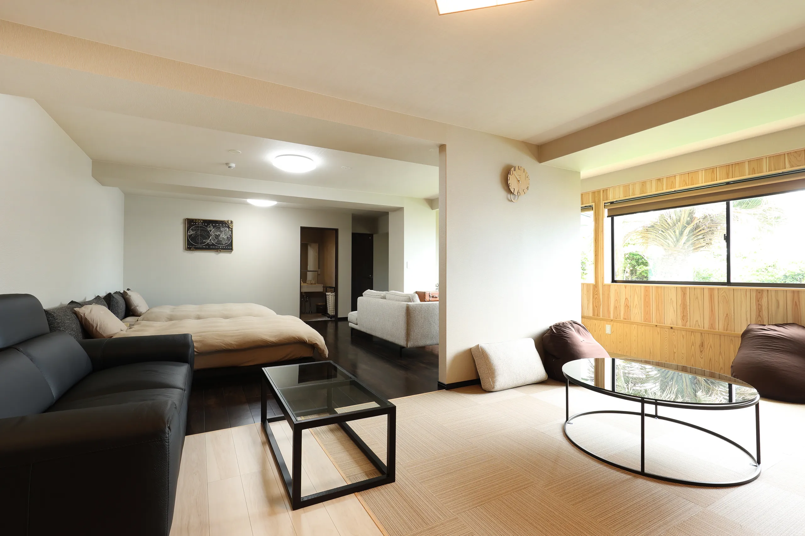 車椅子での利用も可能なバリアフリー設計で、三世代旅行やグループでの滞在にも安心。ソファでくつろぎ、畳で寝転び、それぞれが思い思いのスタイルで過ごせる、自由度の高い客室です。